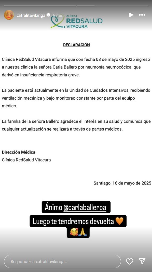 Durante la tarde de este viernes 16 de mayo, Catalina Pulido, quien también trabaja con Carla Ballero en un programa de espectáculos, compartió el parte médico actualizado enviado por la clínica donde está internada hace 8 días.