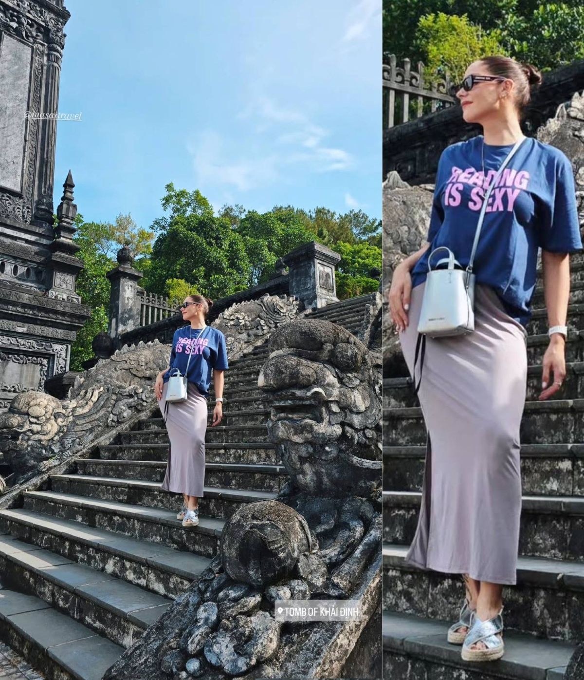 En su viaje por Vietnam, la hija de Raquel Argandoña elige outfits relajados, que le permiten facilidad de movimiento para hacer grandes recorridos, como su visita a la Tumba de Khai Dinh, Patrimonio de la Humanidad en la ciudad de Hué.