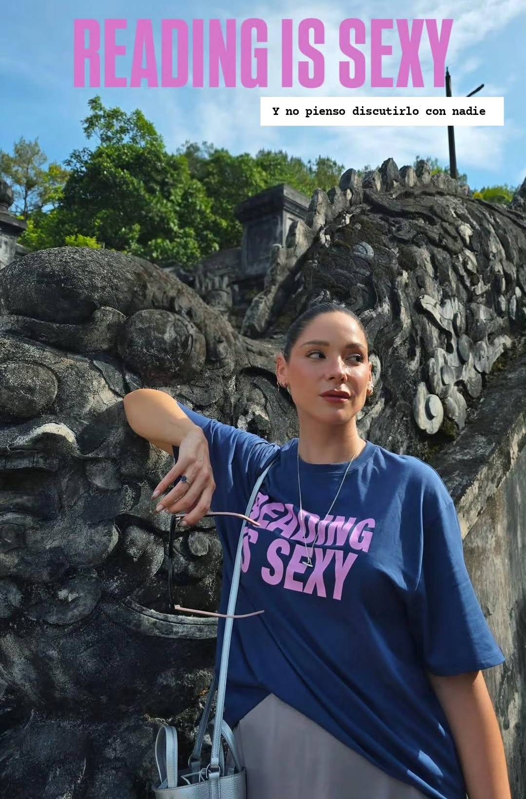 “Leer es sexy”, dice su polera, “y no pienso discutirlo”, agregó Kel en su post. Otro pieza que elevó el glamour de esta propuesta informal, fueron sus lentes oscuros con detalles morados y su clean look.