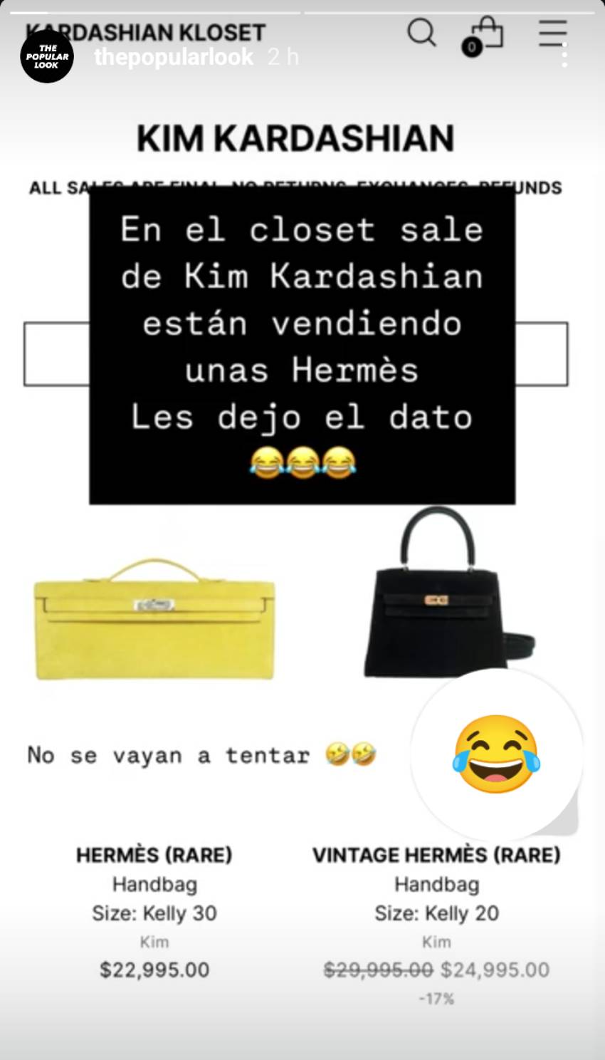 "En el closet de Kim Kardashian están vendiendo unas Hermès, les dejo el dato", indicó al respecto The Popular Look con emojis de risas, a la vez que instó a los aficionados de la moda a "no tentarse" a desembolsar esas grandes sumas de dinero.