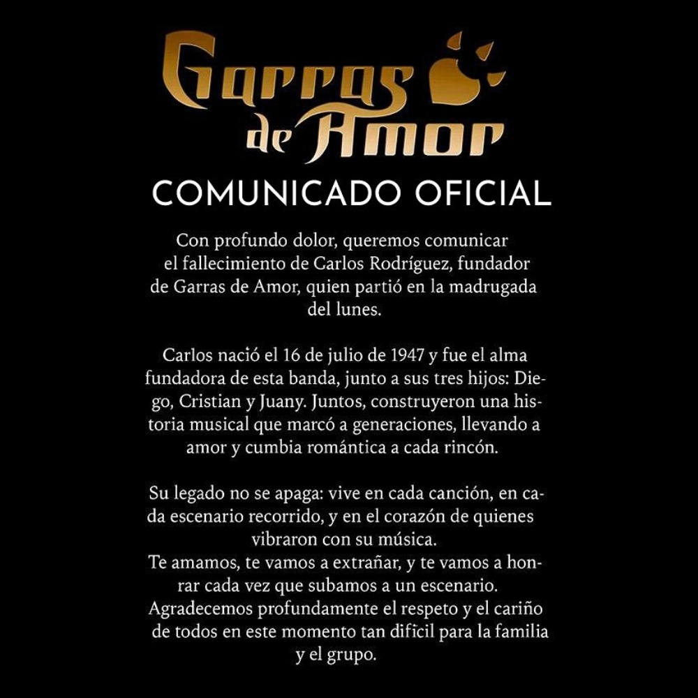 “Con profundo dolor queremos comunicar el fallecimiento de Carlos Rodríguez, fundador de Garras, quien partió en la madrugada del lunes (19 de mayo)”, reza el texto publicado por la banda argentina en redes sociales.