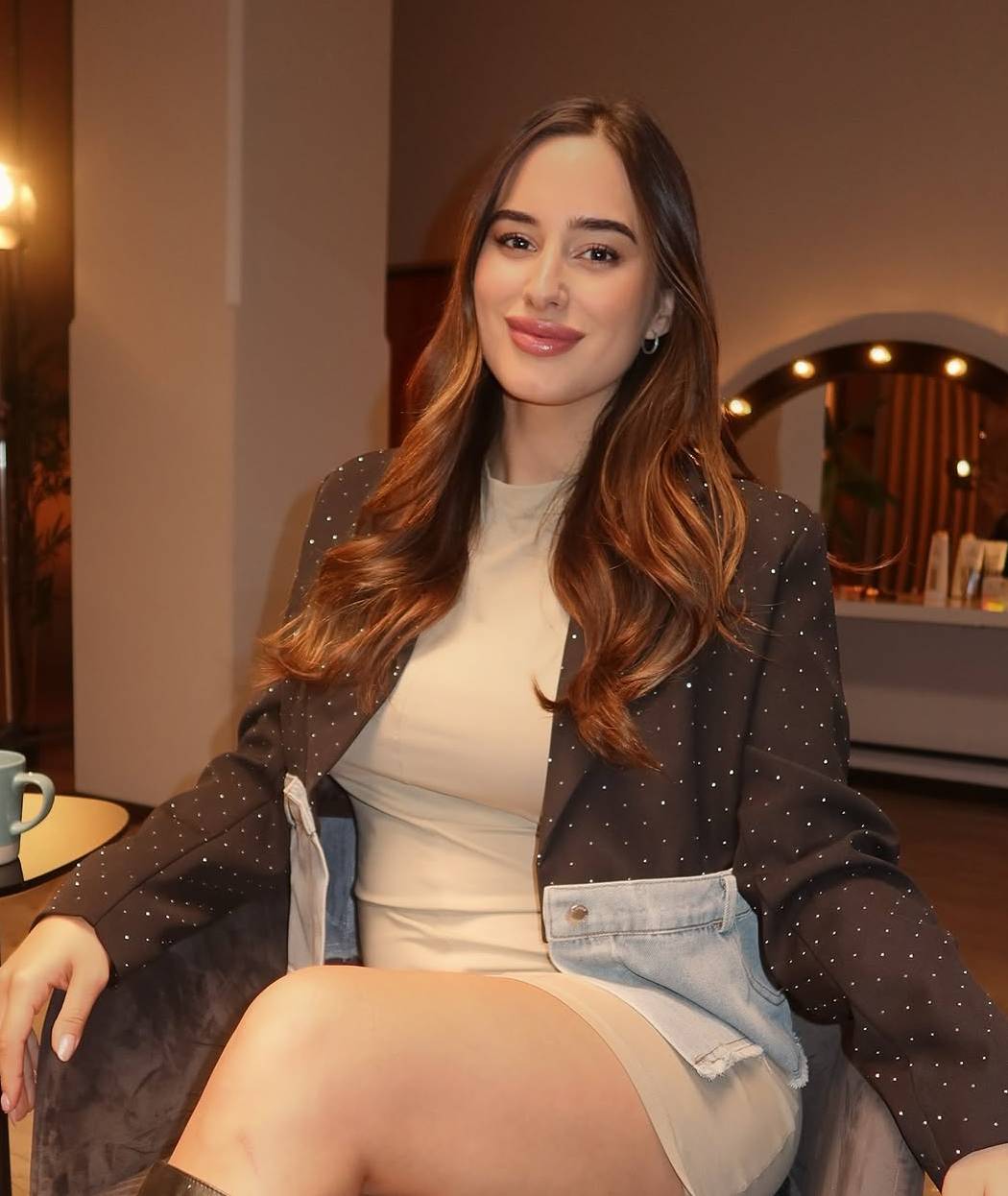 Meli llevó el cabello suelto sobre los hombros con ondas naturales y un maquillaje sencillo con énfasis en el rubor de las mejillas y los labios brillantes. “Vinimos a trabajar cada vez con pollit@ más grande”, escribió la influencer en su publicación de Instagram, destacando que aún no conocen el sexo de su bebé.