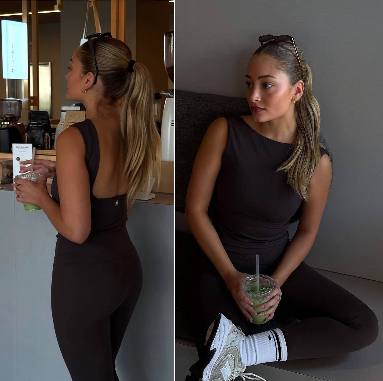 En una publicación reciente se ve cómo combinó unos leggings de corte alto en el color del año, el mocca mousse, que combinó con un body negro de escote cuadrado en la espalda, firmado por Legend Brand.