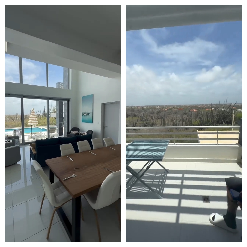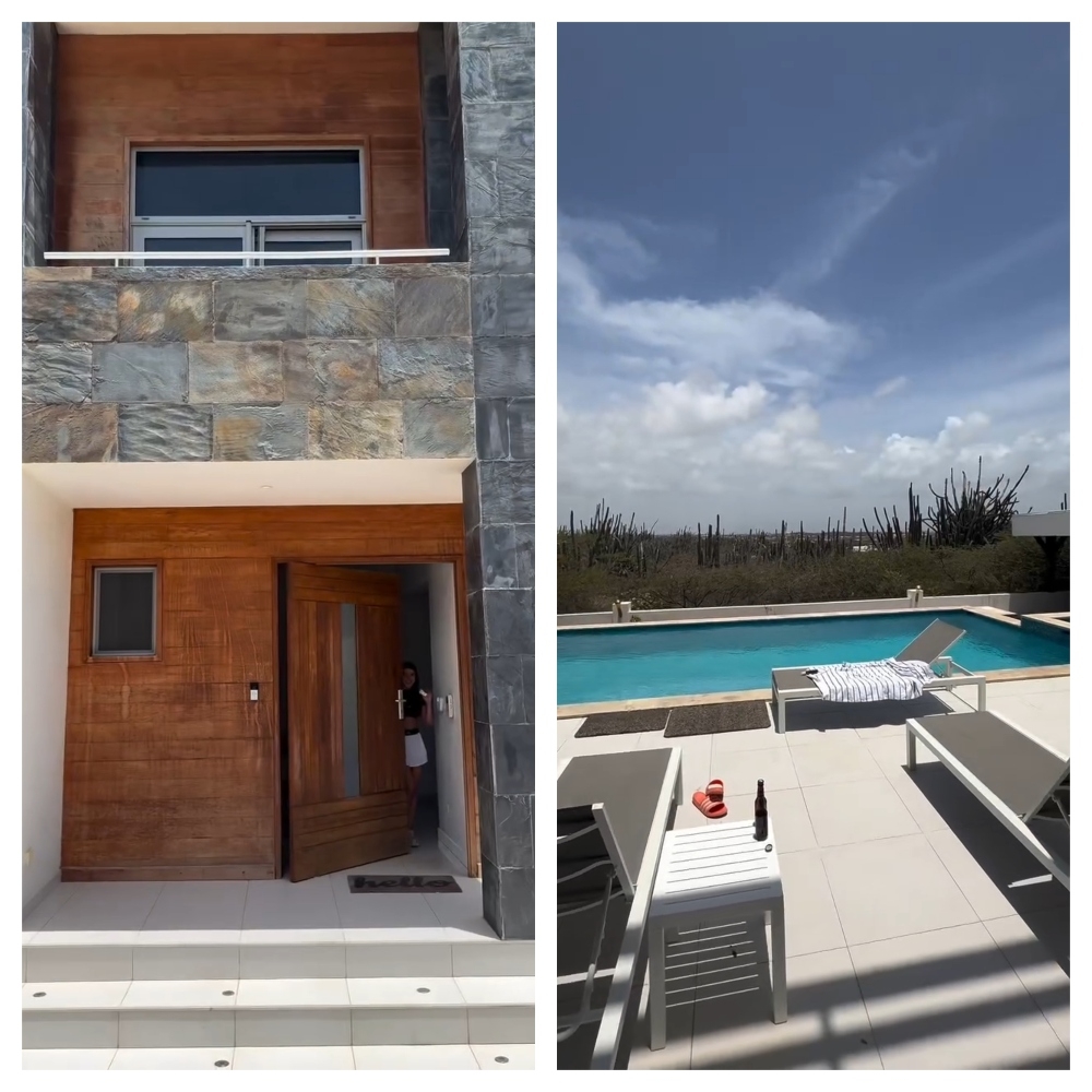 La residencia temporal de la influencer en Aruba cuenta con amplias áreas comunes y un segundo piso con habitaciones y balcones privados. En el registro que compartió se aprecian detalles como una terraza exterior con acceso directo a la zona de descanso y un balcón principal con hermosas vistas.