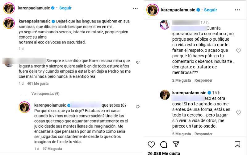 Karen Paola no guardó silencio tras leer el comentario de una usuaria que opinó sobre el quiebre de su relación con Juan Pedro Verdier. La seguidora calificó a la cantante como una “mina que le gusta mentir y que siempre quiere salir bien”.
