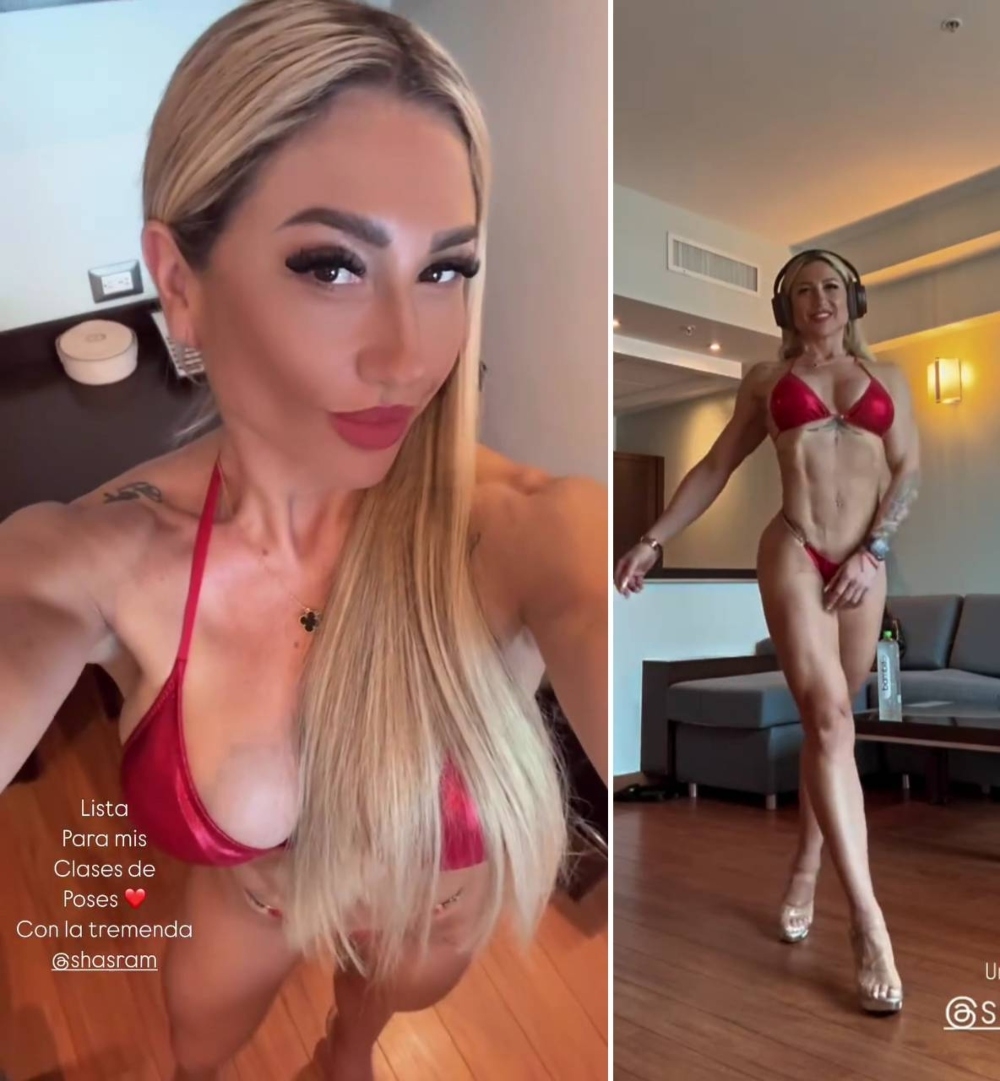 La campeona fitness está trabajando con una preparadora para perfeccionar sus desfiles y poses en el concurso, tal y como se ve en una historia, donde practica con un bikini rojo.
