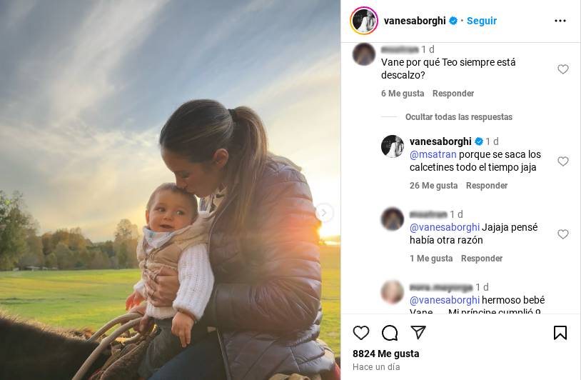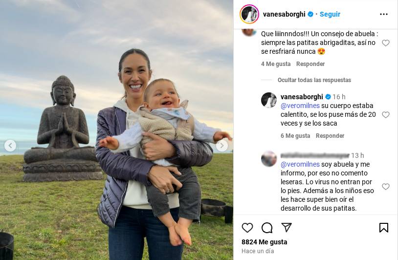 "Vane, ¿por qué Teo siempre está descalzo?", "¡Qué lindos! Un consejo de abuela: siempre las patitas abrigaditas, así no se resfriará nunca”, comentaron dos seguidores. Borghi respondió que el pequeño "se saca los calcetines todo el tiempo” y que "su cuerpo estaba calentito, se los puse más de 20 veces".
