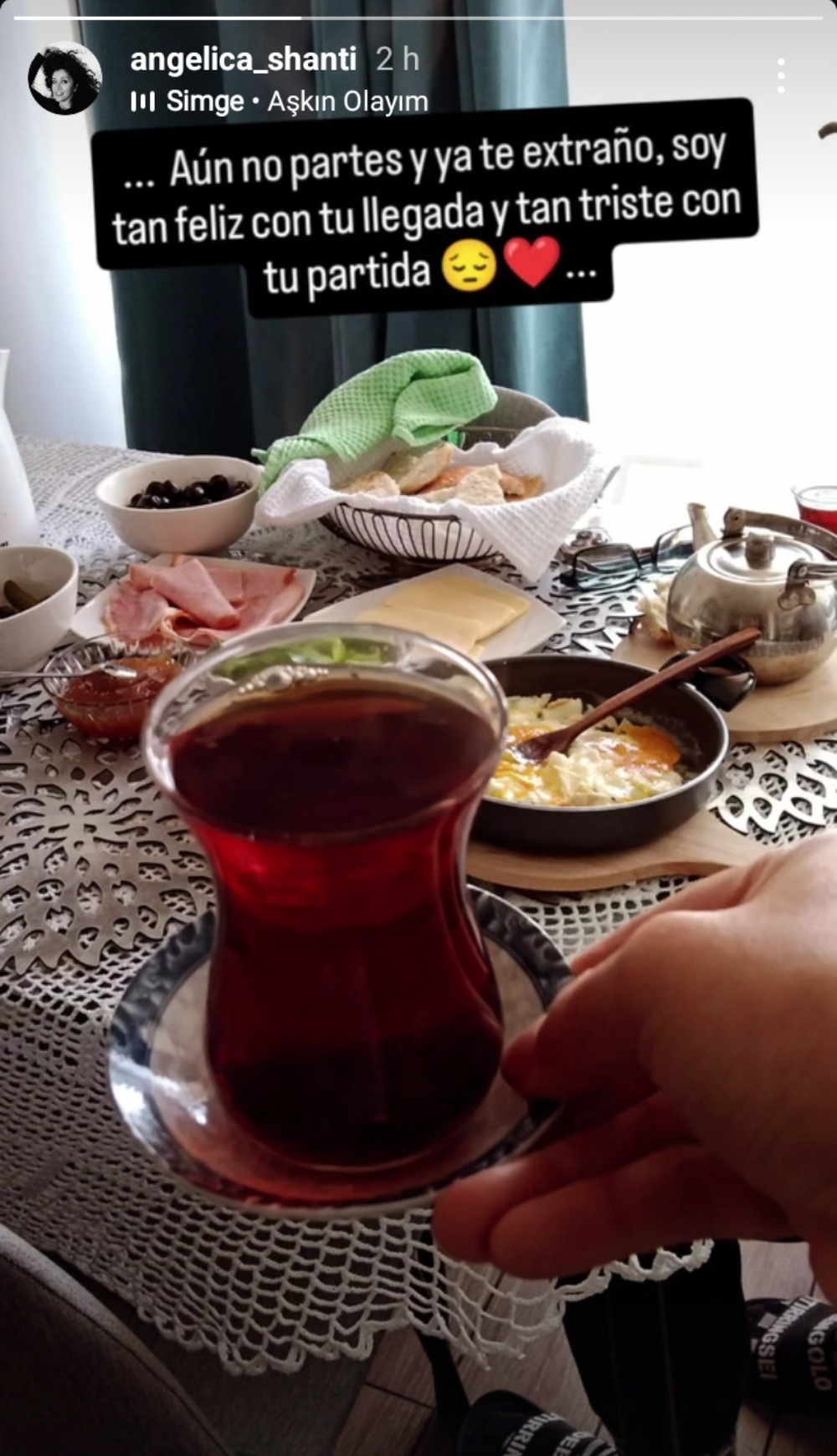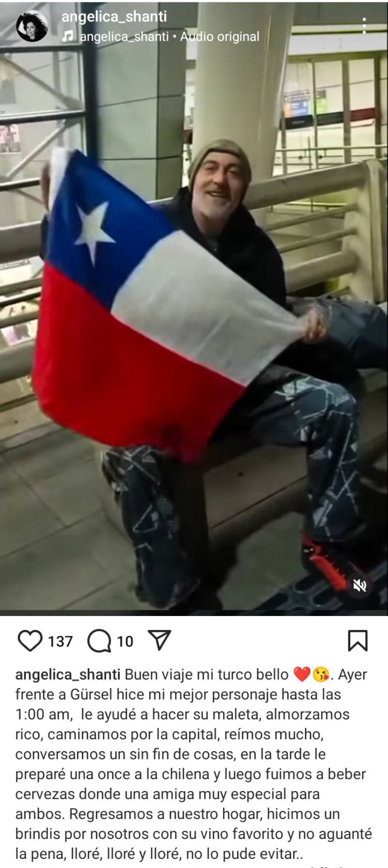 Antes de la partida de Gursel, Angélica publicó una foto con un nostálgico mensaje. “Aún no partes y ya te extraño. Soy tan feliz con tu llegada y tan triste con tu partida”, escribió, para luego confesar su tristeza ahora que ya su pololo se fue.