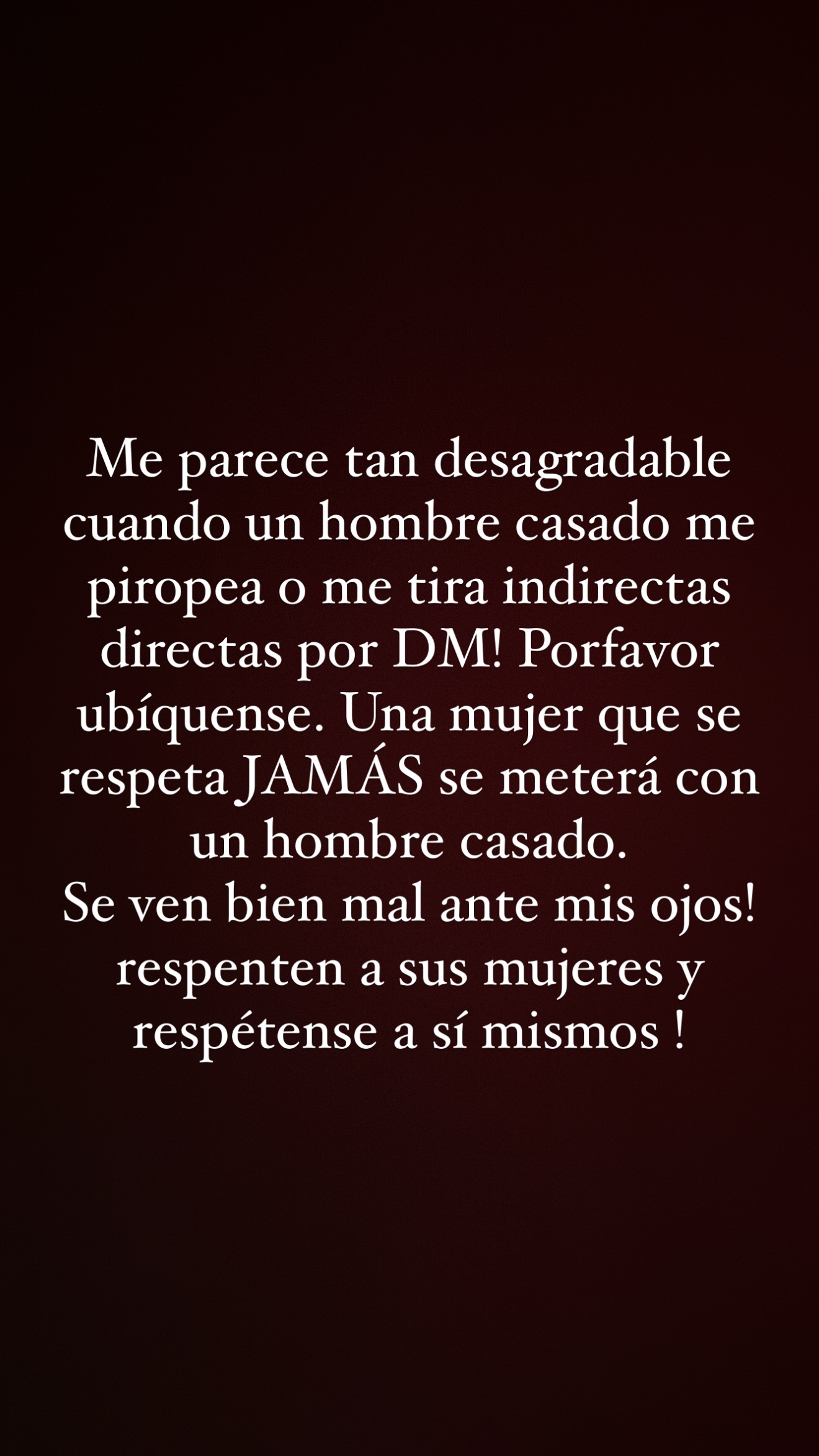 Con esa declaración dejó claro que no aceptará ninguna clase de relación con hombres comprometidos, para que así cese el “coqueteo”, que observa en sus redes. “¡Se ven bien mal ante mis ojos, respeten a sus mujeres y respetense a sí mismos!”, concluyó.