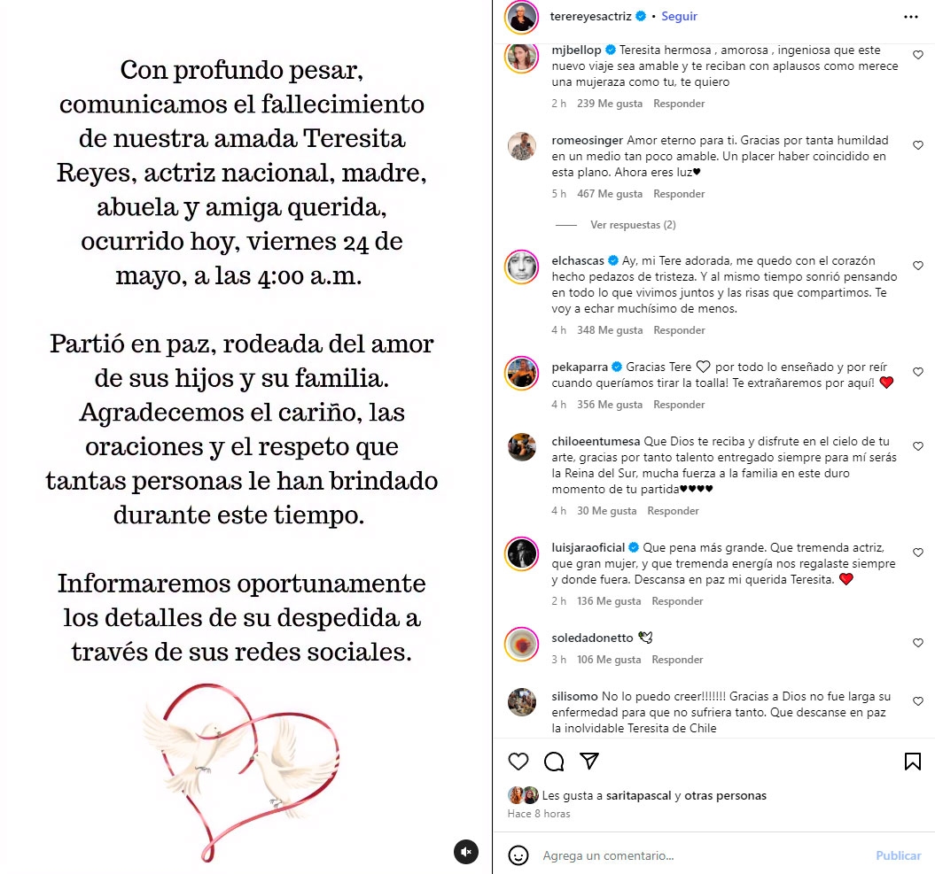"Con profundo pesar, comunicamos el fallecimiento de nuestra amada Teresita Reyes, actriz nacional, madre, abuela y amiga querida. (...) Partió en paz, rodeada del amor de sus hijos y su familia", señaló el comunicado oficial.