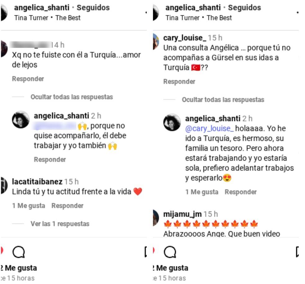 “¿Por qué no te fuiste con él a Turquía? Amor de lejos…”, escribió una usuaria en la publicación, a lo cual Angélica reaccionó tajante: “Porque no quise acompañarlo, él debe trabajar y yo también”.