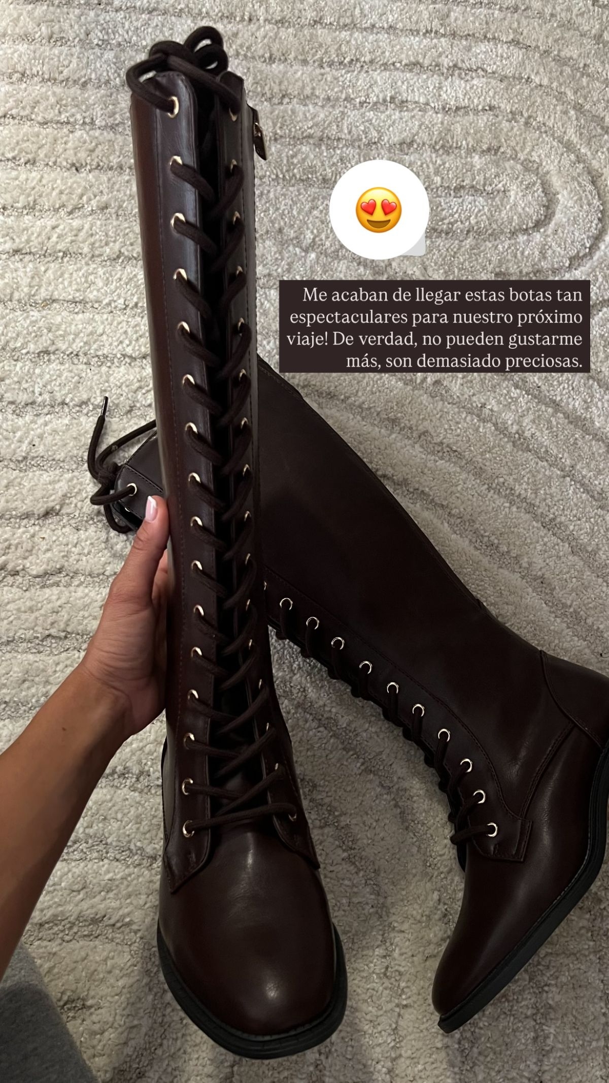 “No pueden gustarme más, son demasiado preciosas”, escribió Marzoli en una historia de Instagram, en la que mostró el par de botas de caña alta negras, con cordones cruzados hasta las rodillas a través de ojales plateados, que complementarán alguno de sus outfits durante el viaje.
