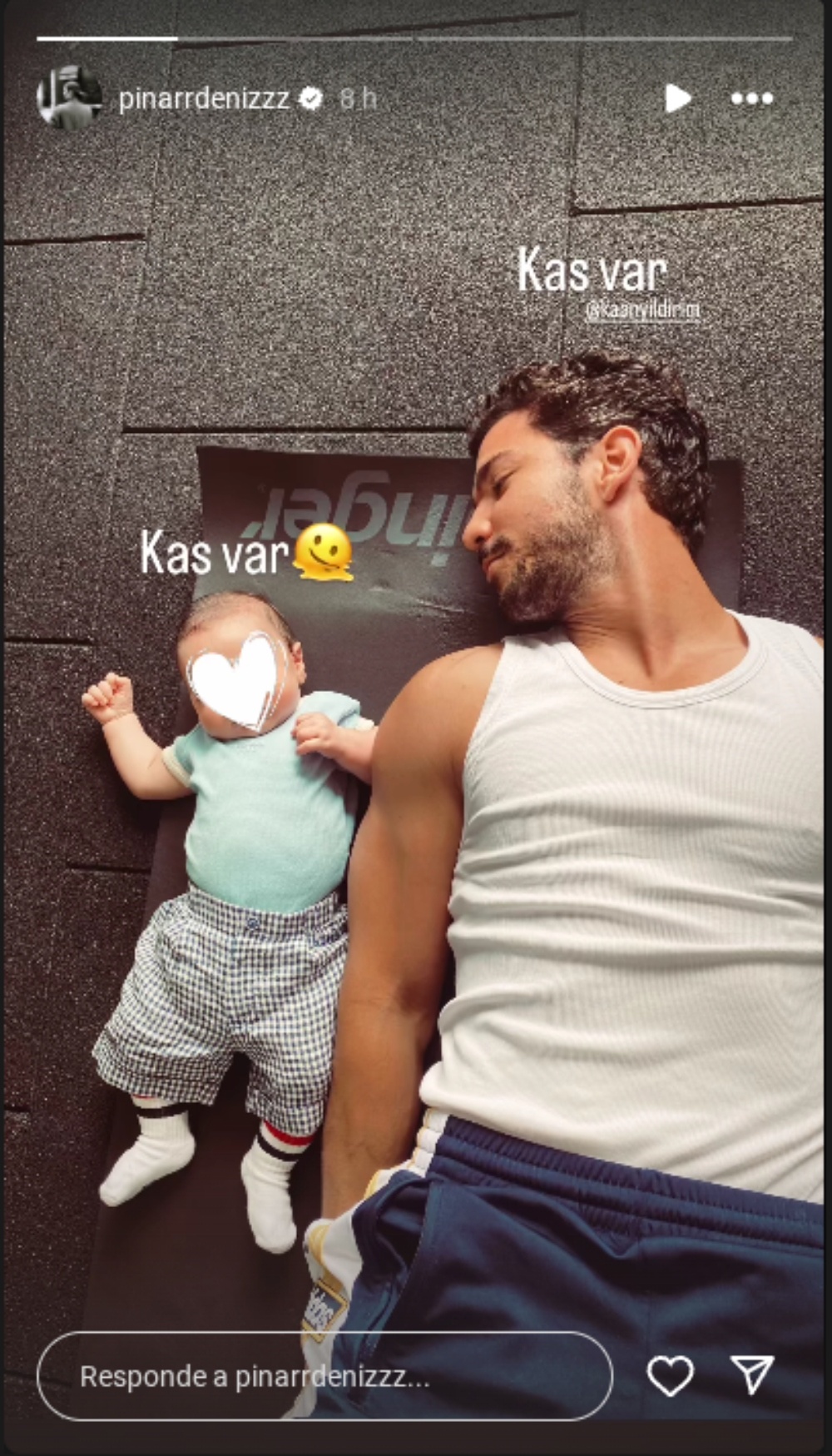 En la fotografía publicada en Instagram se aprecia a Yildirim y a su hijo acostados sobre la colchoneta de un gimnasio. El también actor mira al bebé con ojos amor, mientras Pinar captura el momento.