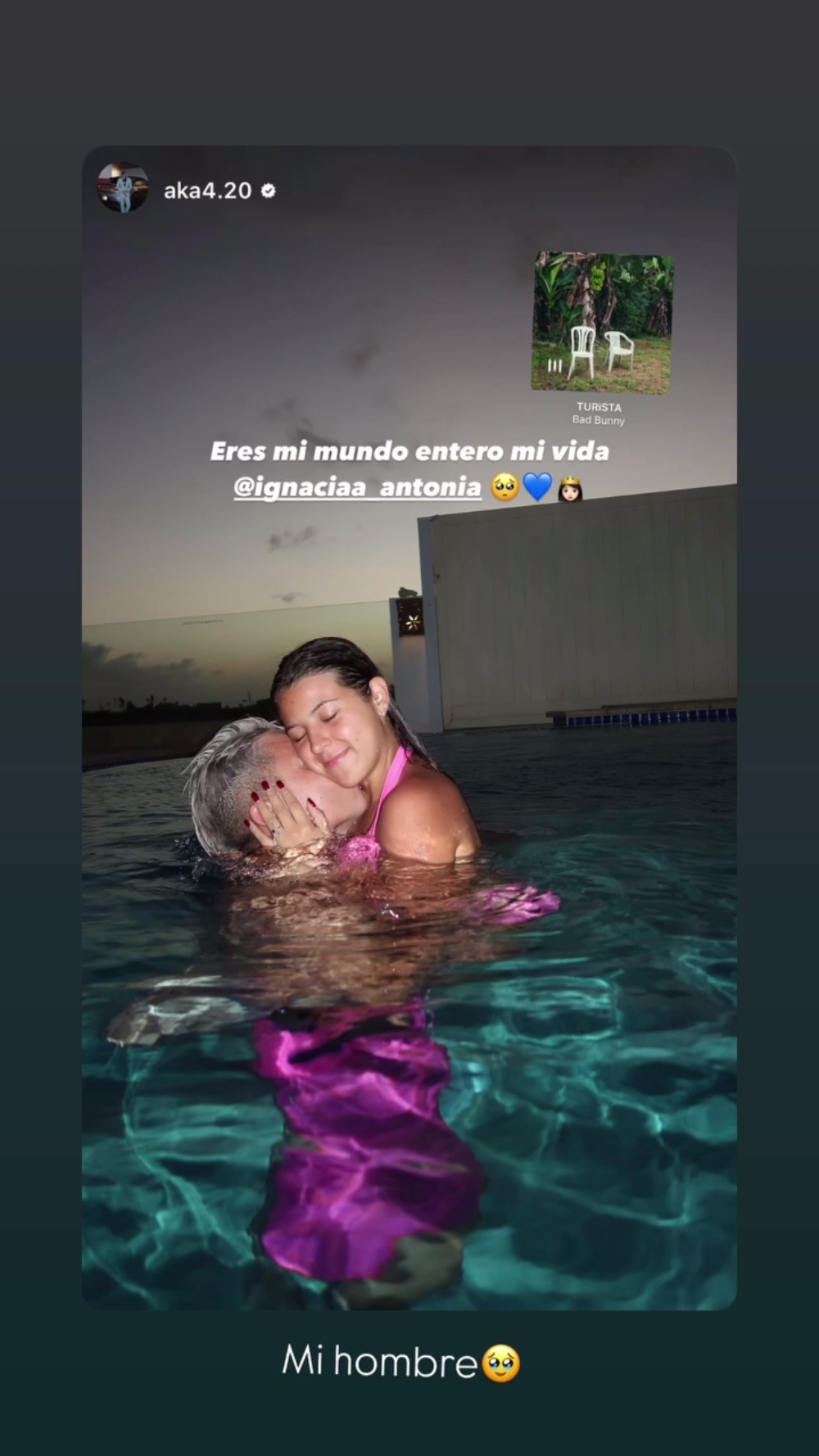 En sus historias de Instagram, el artista posteó una imagen en la que ambos están abrazados en la piscina, frente al atardecer. “Eres mi mundo entero, mi vida”, escribió.