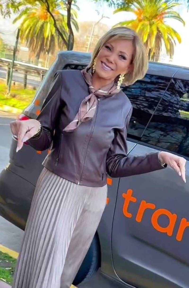 En una historia de Instagram, Argandoña lució una moderna y sofisticada chaqueta de cuero marrón oscuro junto a una maxi falda plisada en color gris satinado, bastante elegante.