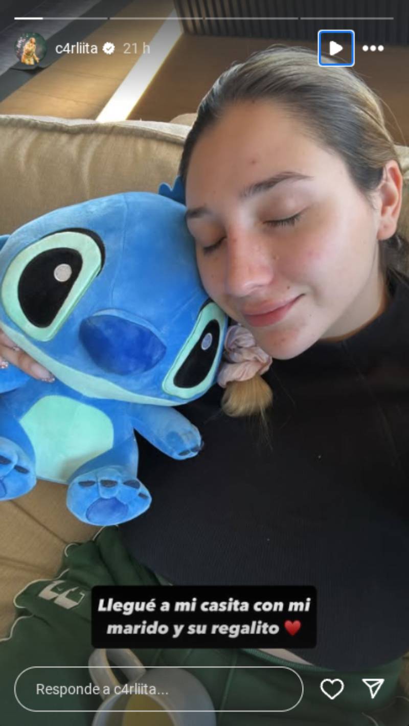 “Llegué a mi casita con mi marido y su regalito”, escribió Carlita sobre el presente que recibió del cantante estadounidense y ahora se convirtió en su compañero favorito.