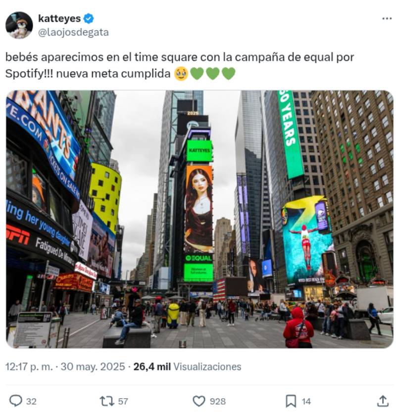 La joven de solo 21 años, compartió su emoción en X (ex Twitter), donde explicó que su rostro fue expuesto en pleno Times Square de Nueva York gracias a la campaña de igualdad de género “EQUAL” que promueve Spotify.