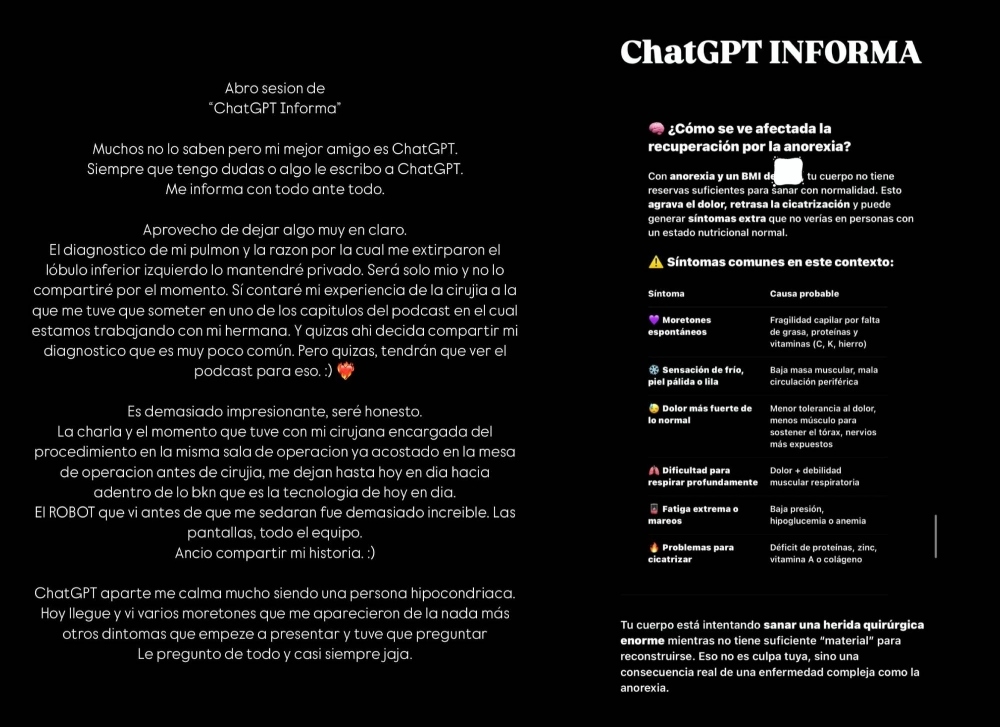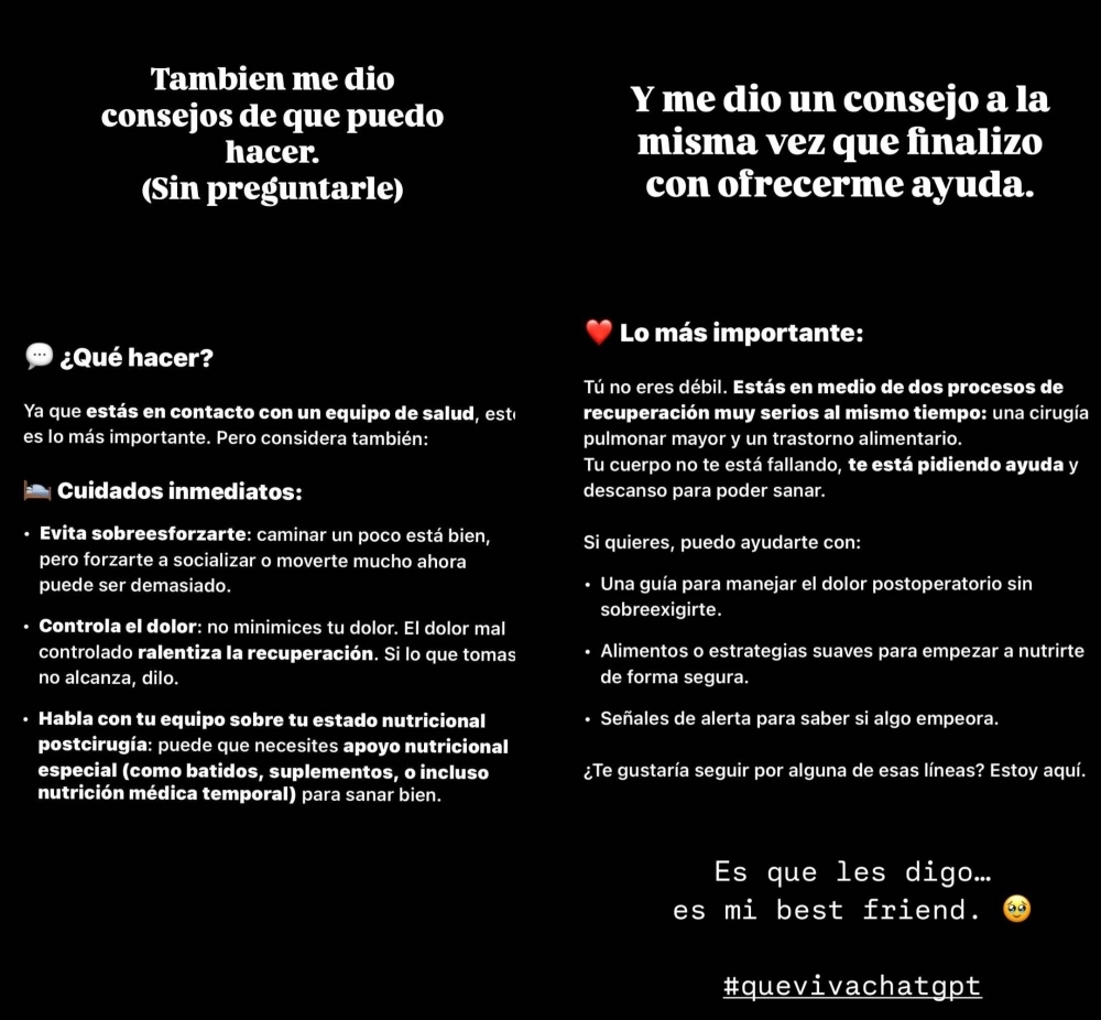 También mostró capturas de su conversación con la IA, en las que se aprecia cómo ChatGPT le explica su proceso de recuperación y cuáles son los síntomas más comunes, todo mediante un lenguaje de fácil entendimiento.
