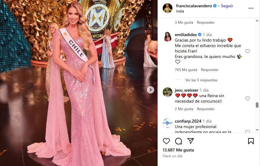 En el post, la Miss Universo Chile 2024, Emilia Dides, felicitó a Lavandero por su desempeño en el certamen: “Gracias por tu lindo trabajo. ¡Me consta el esfuerzo increíble que hiciste, Fran!”, expresó.