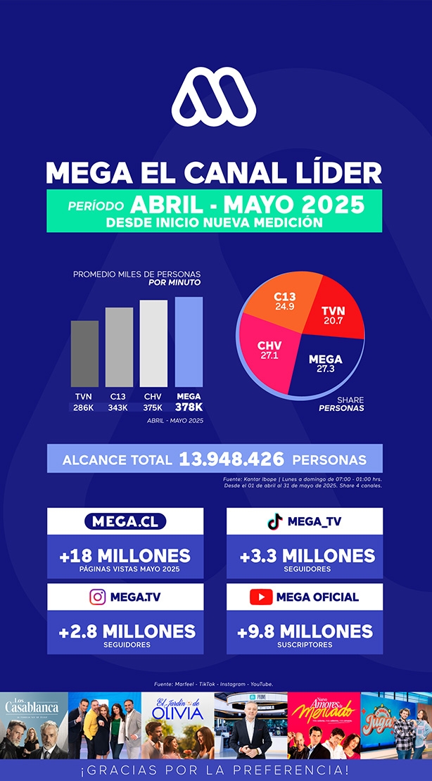 Desde el 1 de abril hasta el 31 de mayo 2025, Mega promedió 377.759 personas por minuto. En ese mismo periodo TVN promedió 285.559, CHV 375.080 y 343.293 Canal 13. En este lapso, el canal tuvo un alcance total de 13.948.426.