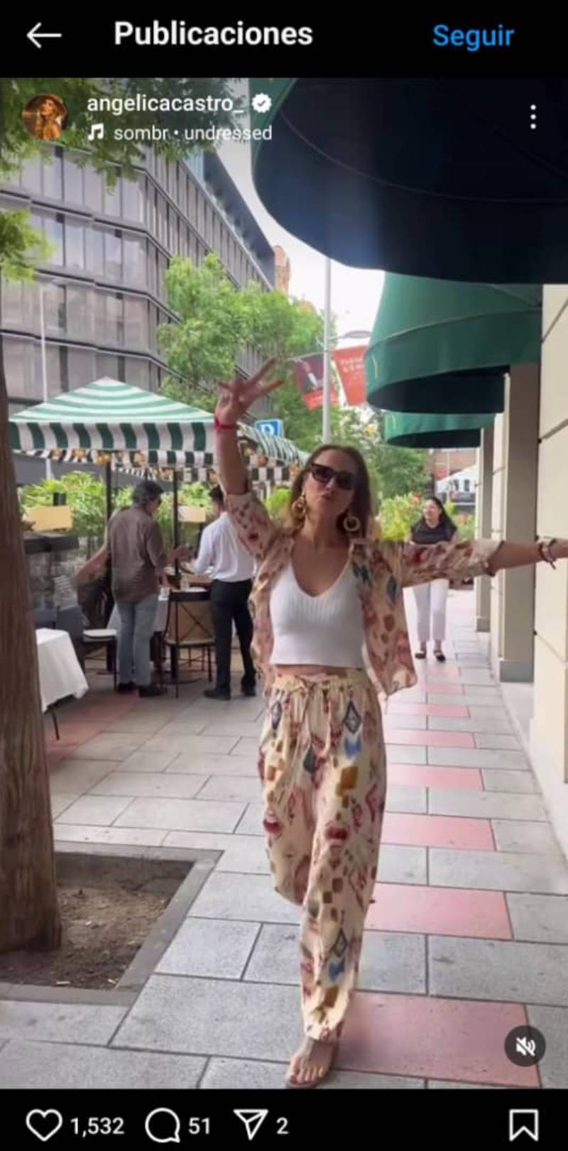 Angélica Castro complementó este outfit con sandalias planas, lentes de sol, maxi aros y varios brazaletes para crear un look fluido y bohemio que cautivó a sus seguidores.