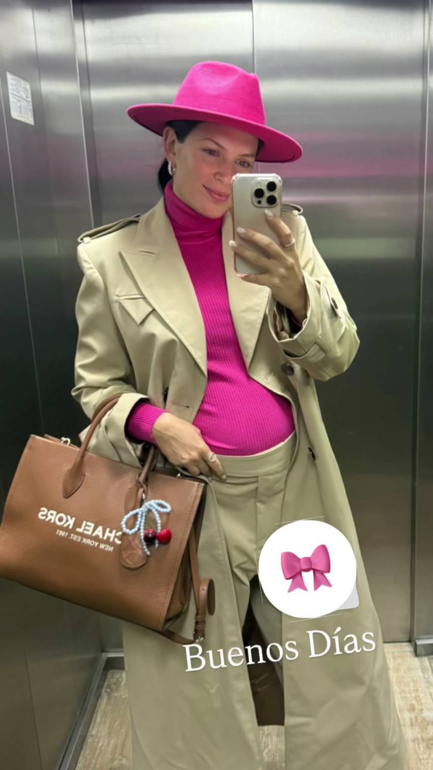 ¡El armario pre mamá de Eugenia Lemos crea un look audaz! Gabardina beige, jersey fucsia y sombrero