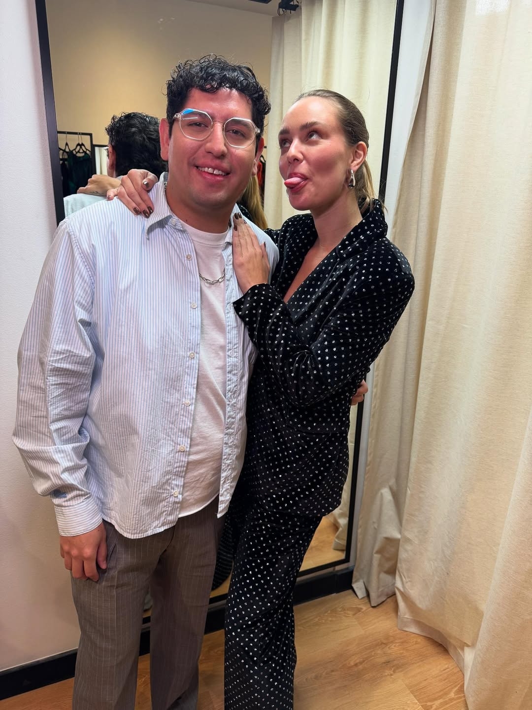 Para la inauguración de este atelier de alquiler, Kika Silva eligió un conjunto de pantalón y blazer negros, con pequeños lunares plateados, una suma de sobriedad que desafío al llevar solo un bra debajo de su chaqueta.
