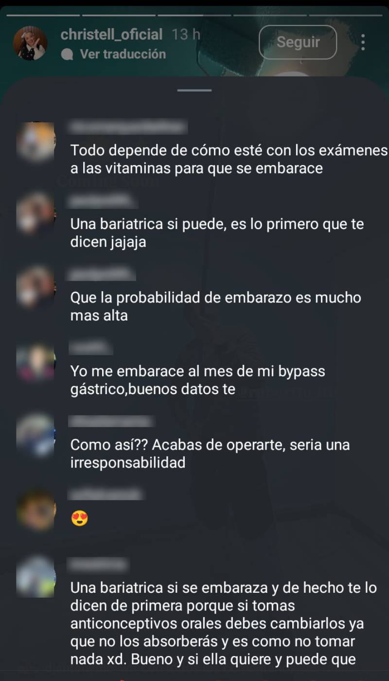 Algunos seguidores explicaron que en pacientes bariátricas se incrementa la posobilidad de embarazo. “Yo me embaracé al mes de mi bypass gástrico”, escribió una usuaria.