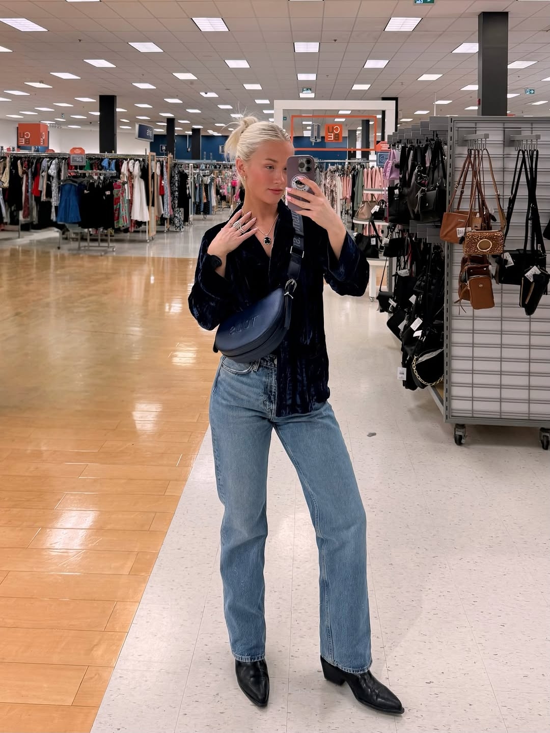 Vesta lo combinó con una blusa confeccionada en terciopelo negro y botas vaqueras. Una cartera a juego, de la marca Tous, fue el complemento para cerrar su primer look informal.