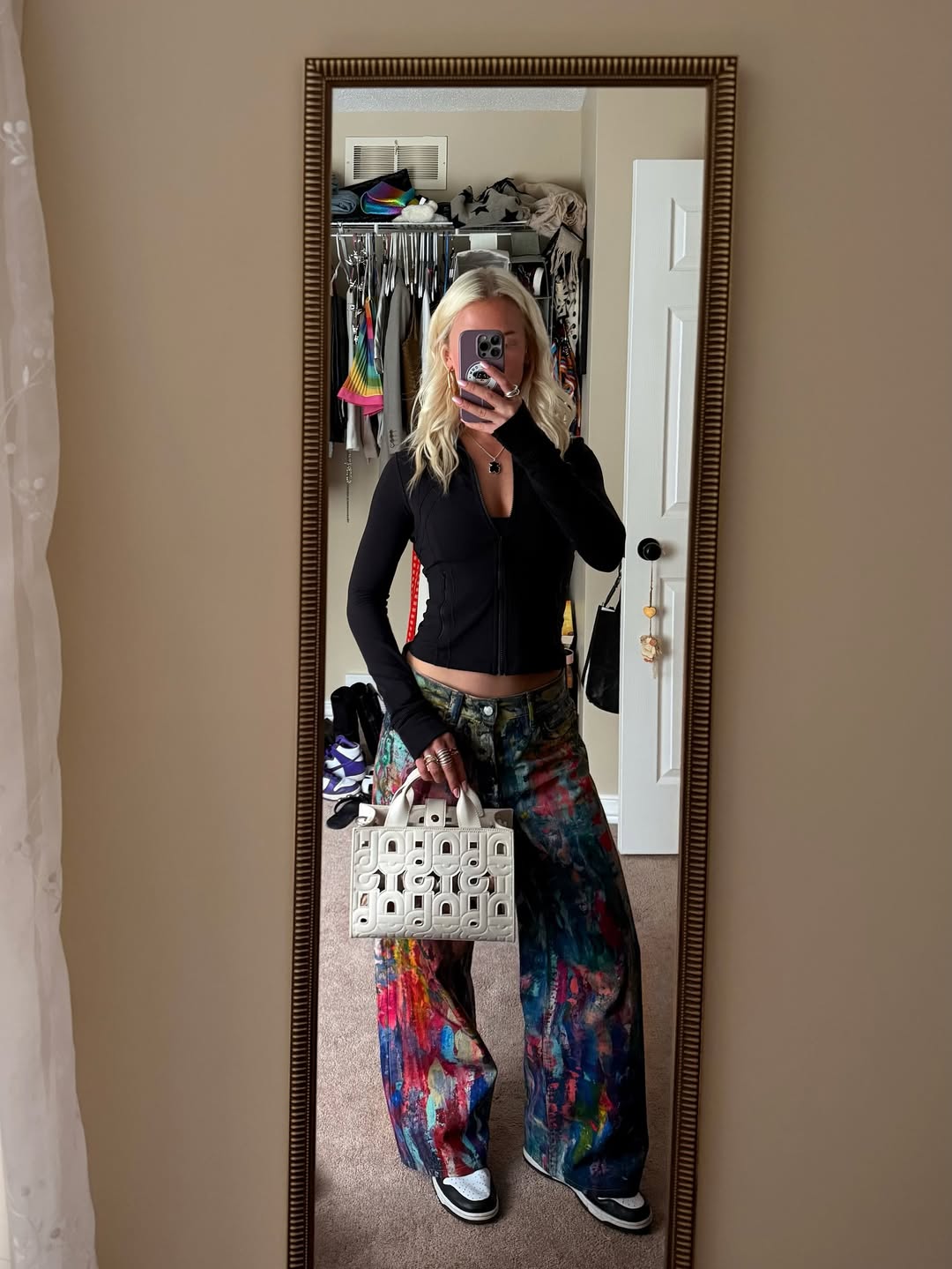 La cantante de música urbana se distingue por lucir diseños únicos e irrepetibles, y esta ecuación la tomó para llevar un pantalón personalizado. Bajo un estilo acampanado, múltiples pinceladas de colores pintaron la superficie del jean. Lo usó con un top negro de mangas largas y cierre frontal, junto a una cartera Tous, modelo Amaya en color blanco.