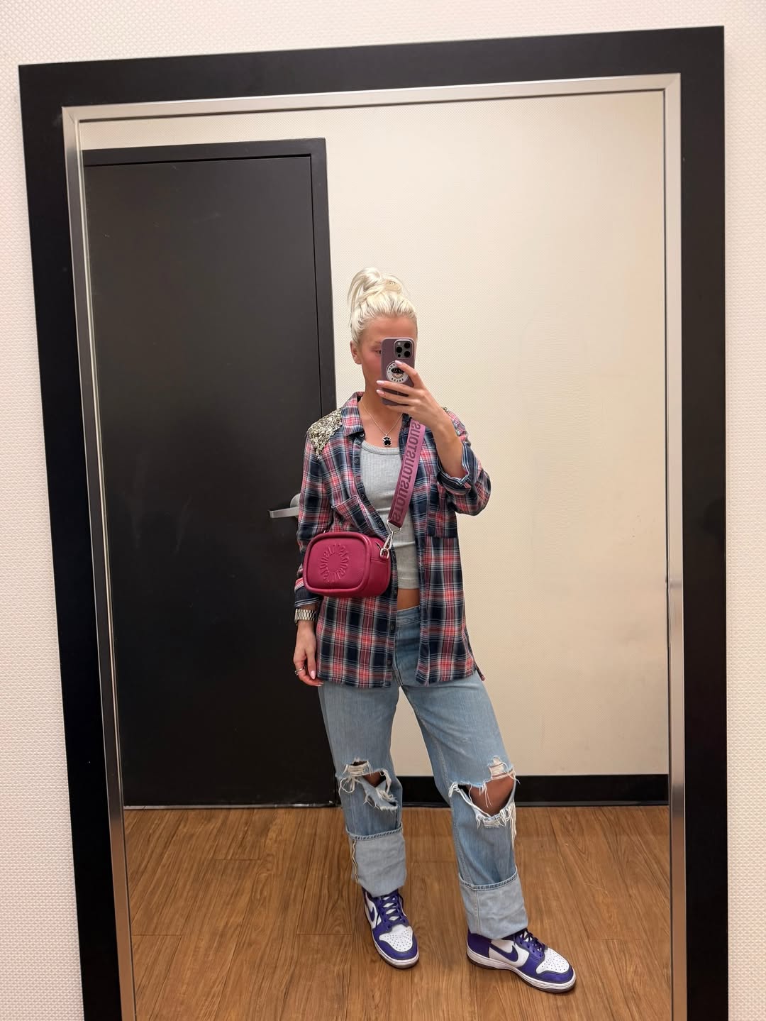 La influencer sacó a relucir otra tendencia, el “look de leñador estadounidense”, con la clásica camisa a cuadros de algodón grueso, en tonos rojo y azul, ofreciendo una estética relajada y despreocupada. Selló su outfit con zapatillas deportivas y un bolso bandolero burdeos.