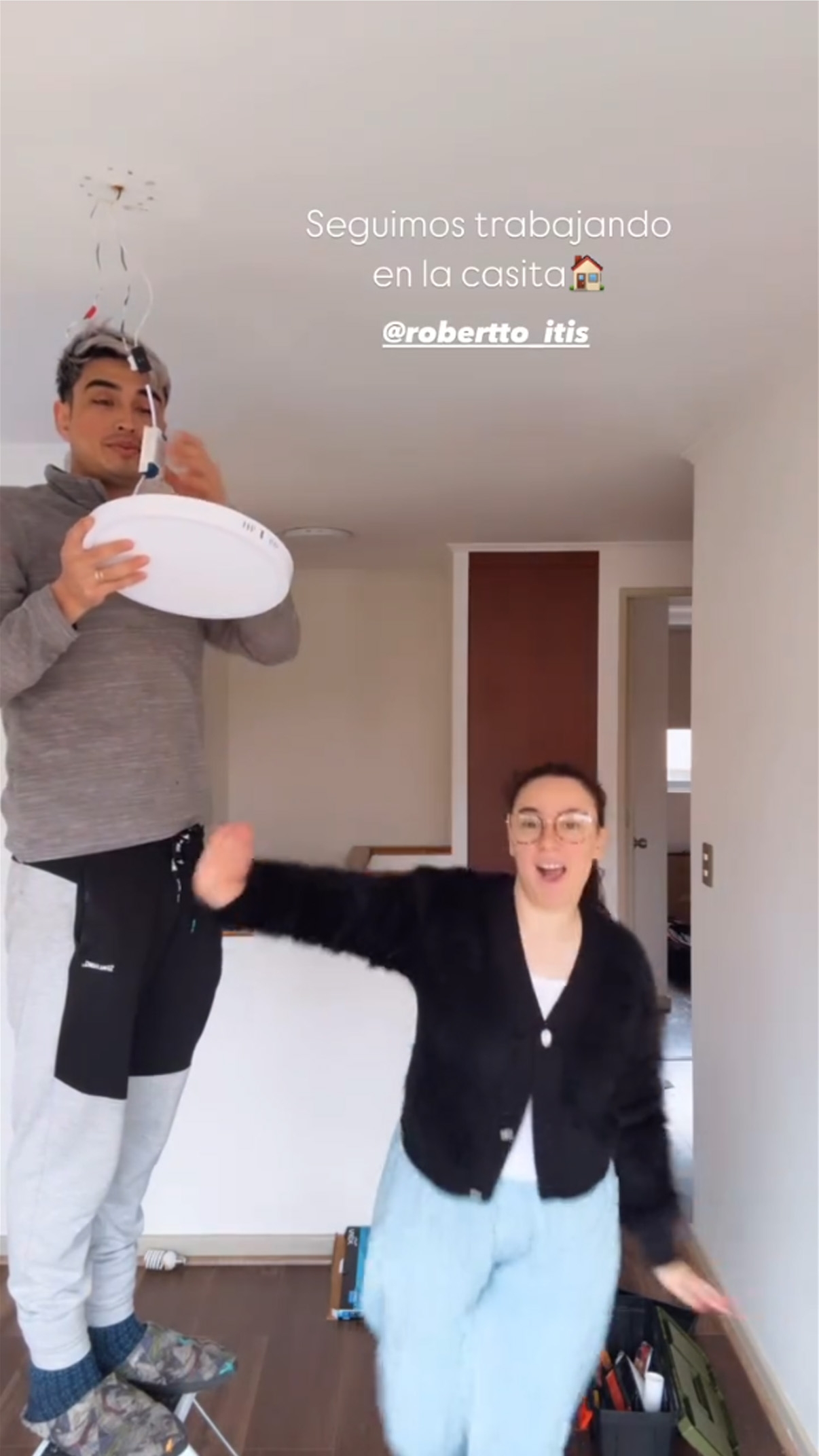 "Seguimos trabajando en la casita", escribió sobre el video, donde se ve a su esposo instalando una lámpara led de techo, mientras que ella verifica que la electricidad está cortada.