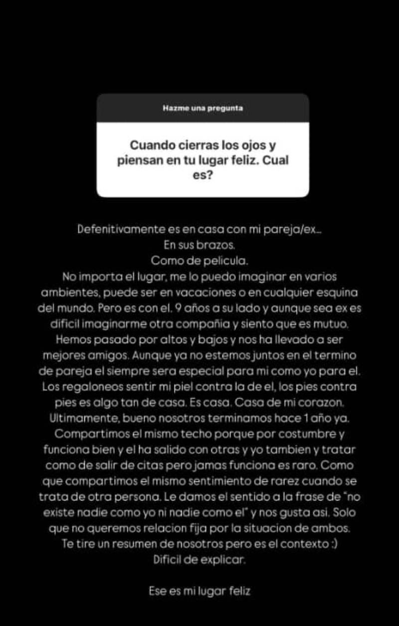 En otro post, el hijo de DJ Méndez respondió la pregunta de un usuario sobre “su lugar feliz”: "Definitivamente es en casa con mi pareja/ex... como de película."