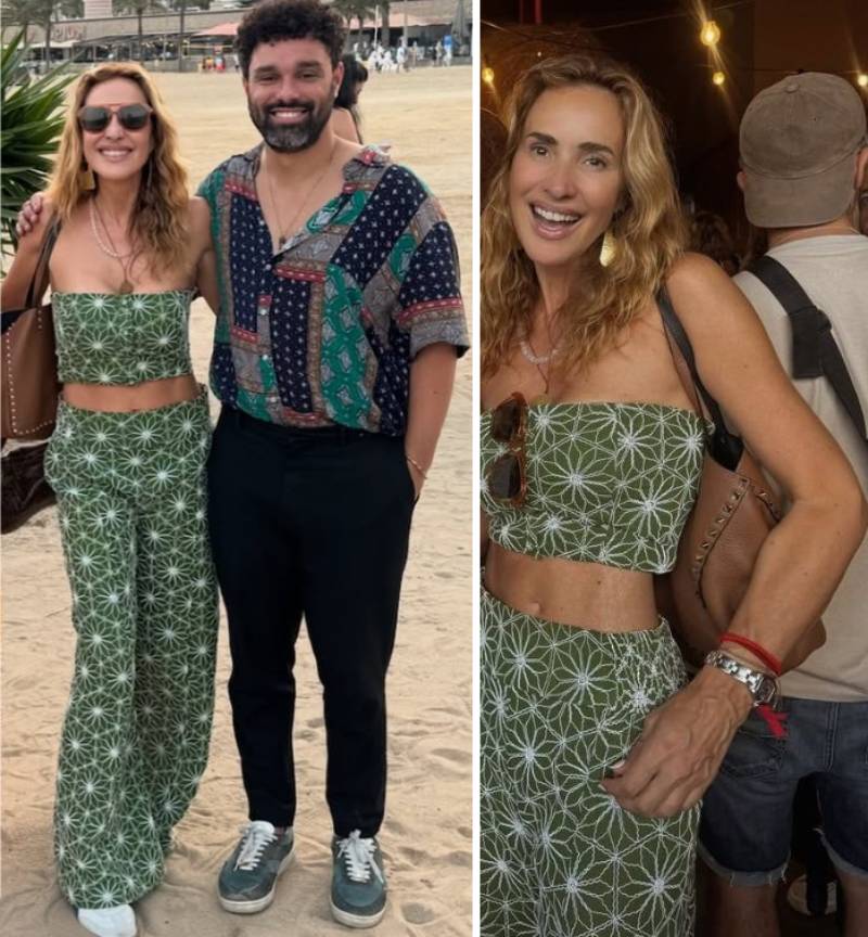 La comunicadora escogió un conjunto de dos piezas compuesto por un pequeño top sin mangas, de escote recto en strapless, ceñido al cuerpo y un pantalón holgado de amplia bota estilo palazzo, ambas piezas bajo el mismo textil estampado.