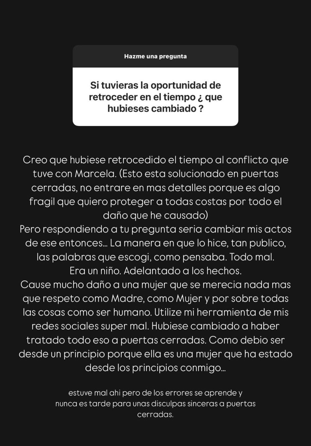 “Creo que hubiese retrocedido el tiempo al conflicto que tuve con Marcela. Esto está solucionado a puertas cerradas, no entraré en detalles porque es algo frágil que quiero proteger a toda costa por el daño que he causado”, empezó diciendo.