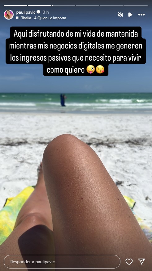 Ahora, la creadora de contenido fitness se sacó una foto mientras tomaba sol en la playa y escribió: "Aquí disfrutando de mi vida de mantenida, mientras mis negocios digitales me generen los ingresos pasivos que necesito para vivir como quiero".