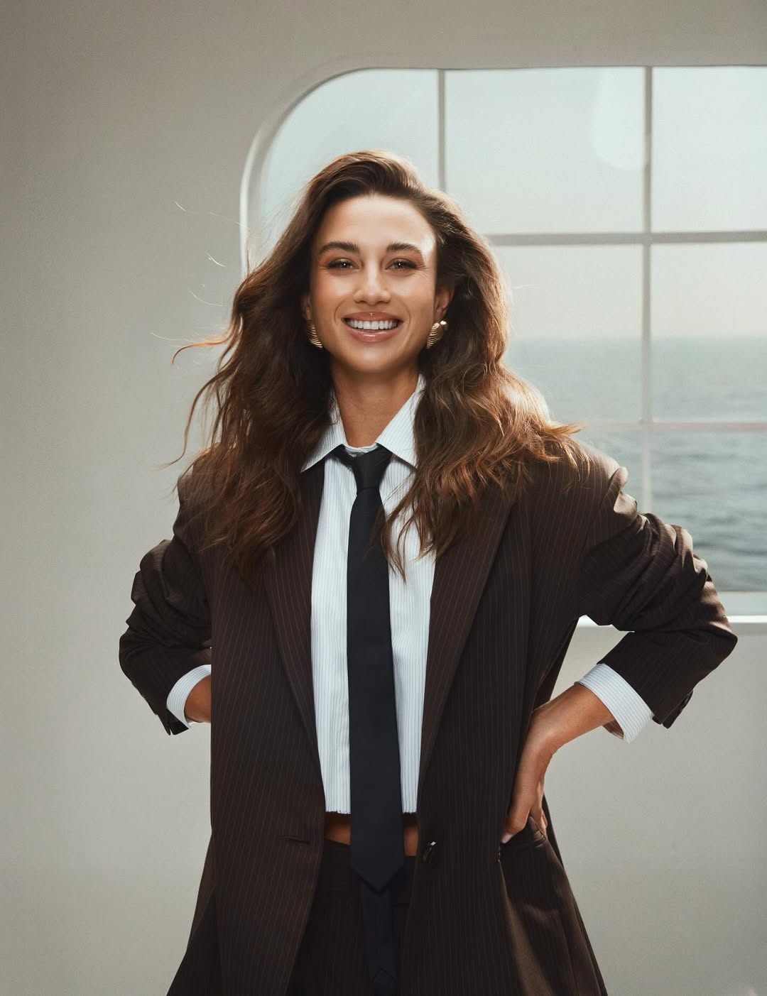 De manera impecable, Tita Ureta, posó para la revista Velvet dejando aflorar ese carácter indomable que la caracteriza, con el que lució fresca y sofisticada. Llevó una fina corbata negra sobre el lienzo blanco de una camisa cropped de mangas largas, abotonada hasta el cuello.
