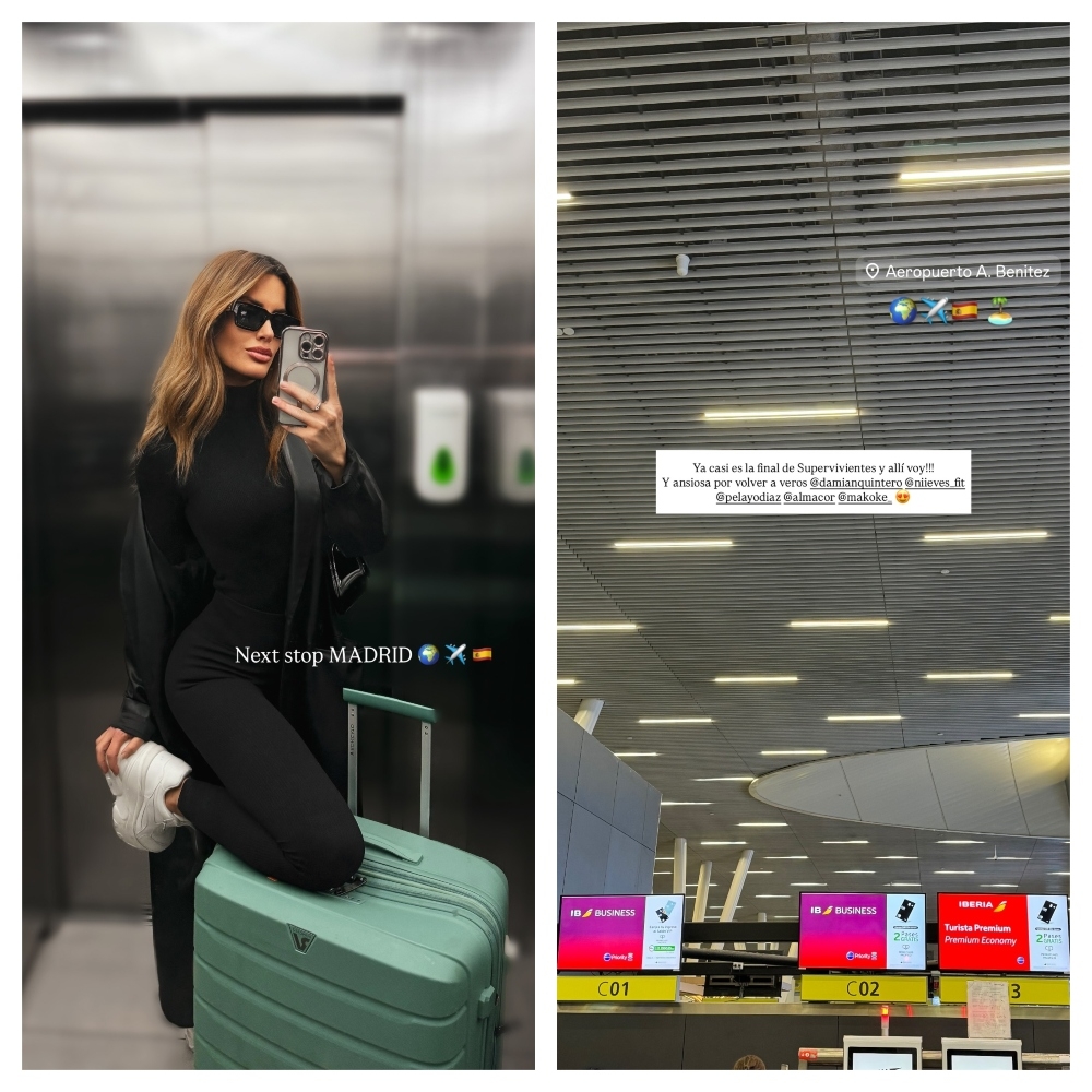 La influencer compartió con sus seguidores en Instagram los momentos previos a su vuelo hacia la capital española. “Ya casi es la final de Supervivientes y allí voy”, escribió sobre una foto desde el aeropuerto de Santiago, a donde llegó vestida de negro y con una enorme maleta.