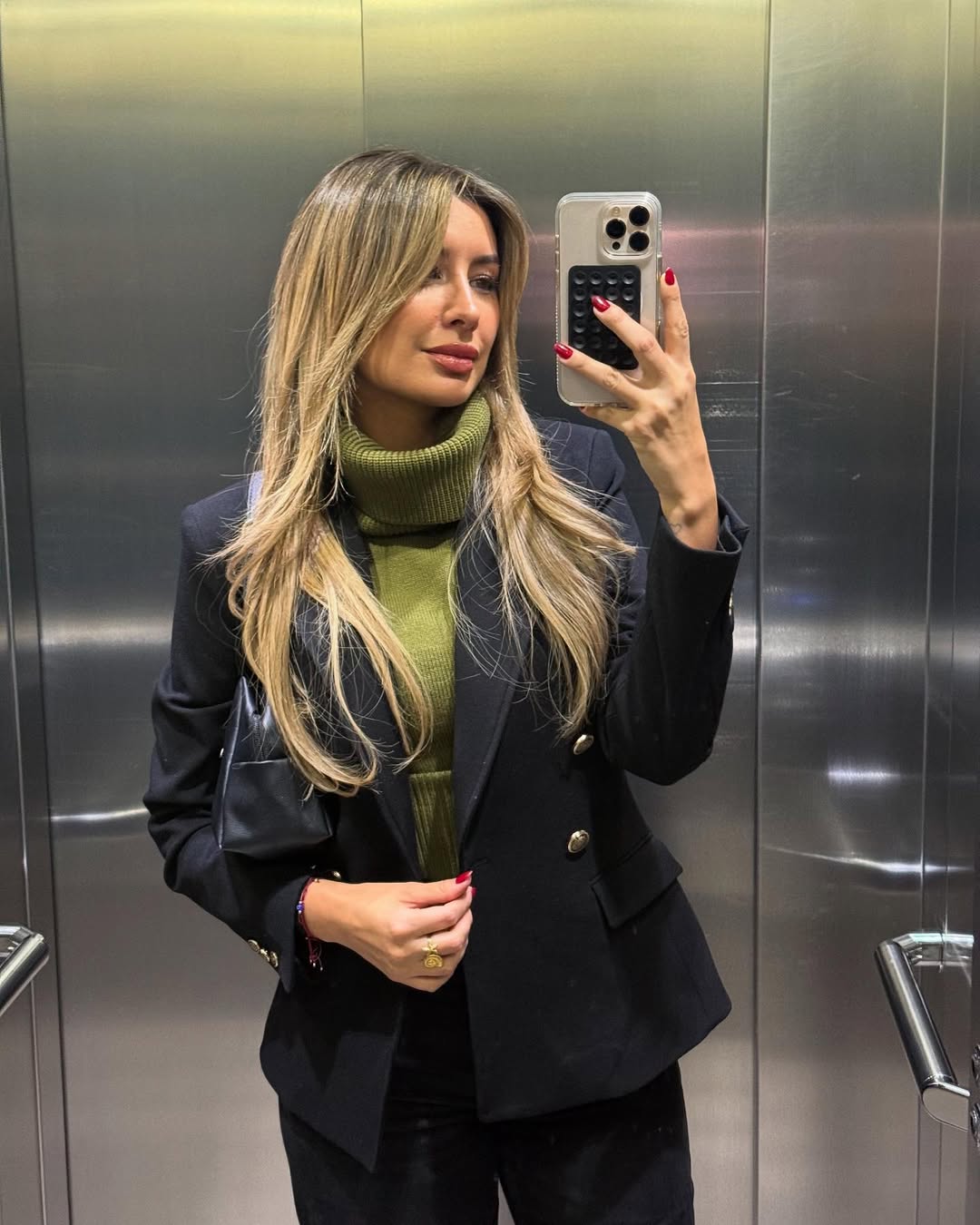 La presentadora nacional eligió un jersey mullido, con cuello de tortuga doblado en un adorable verde pistacho. Lo combinó con un traje sastre negro, de blazer con botones dorados y pantalón de piernas rectas.