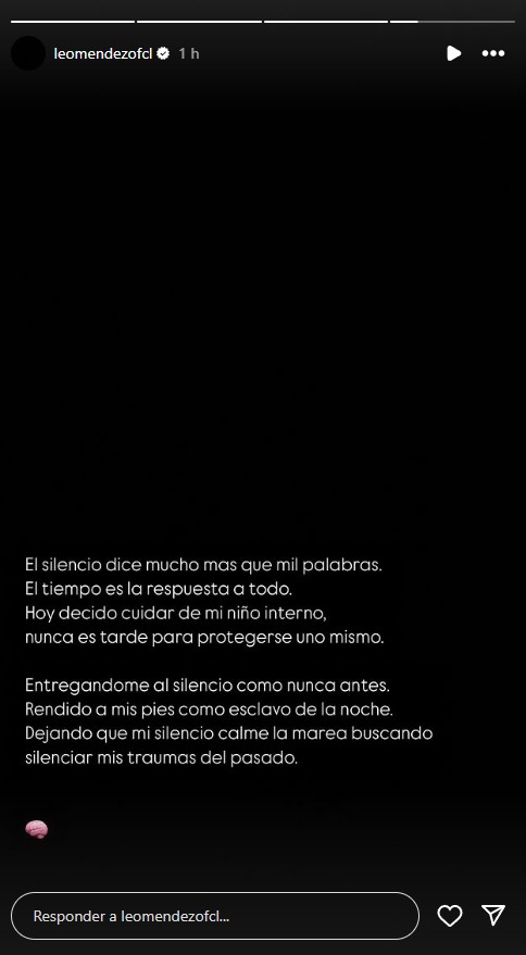 Finalmente, el hijo de DJ Méndez decidió no entregar más detalles de lo que realmente estaba pasando: "Entregándome al silencio como nunca antes. Rendido a mis pies como esclavo de la noche. Dejando que mi silencio calme la marea buscandos silenciar mis traumas del pasado".