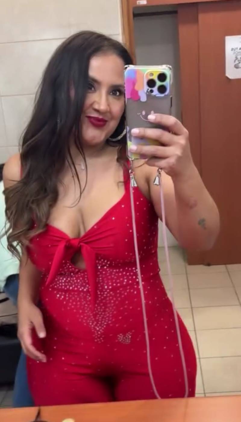 “Y estoy listaaaa, así quedé”, exclamó Pame, mientras mostraba el resultado: un ceñido enterito lleno de brillantes sobre un vibrante tono.