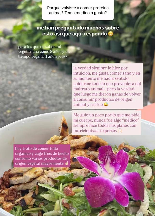 La influencer, quien fue “vegetariana como ocho años y un tiempo vegana (1 año aproximadamente)”, compartió su experiencia a través de una dinámica de preguntas y respuestas en sus historias de Instagram.