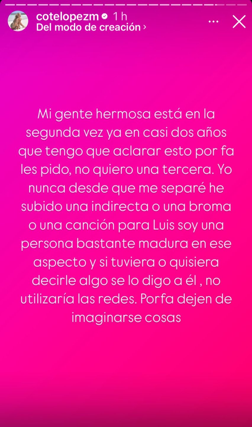"Yo nunca, desde que me separé, he subido una indirecta, una broma o una canción para Luis. Soy una persona bastante madura en ese aspecto, y si tuviera algo que decirle se lo diría a él, no usaría las redes. Porfa, dejen de imaginarse cosas", agregó.