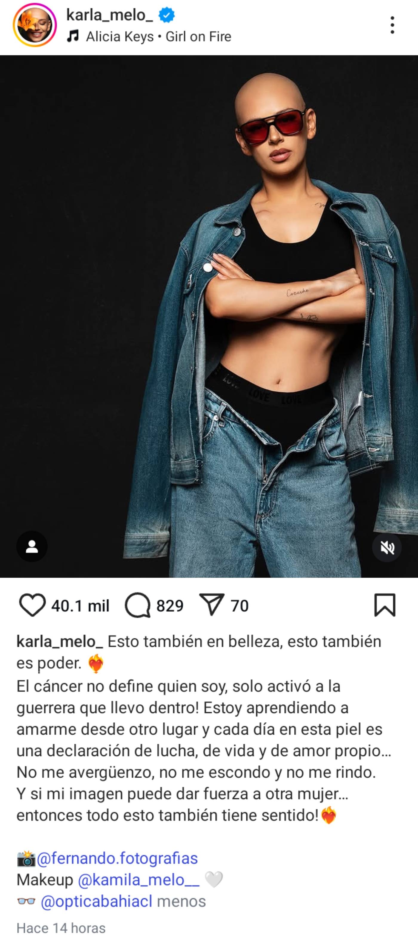 “Esto también es belleza, esto también es poder. El cáncer no define quién soy, solo activó a la guerrera que llevo dentro”, escribió junto a una fotografía que publicó en Instagram, en la que posa con un outfit denim, lentes de sol y su cabeza totalmente rapada.