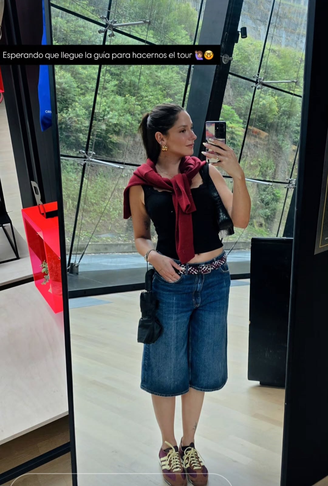 El inconfundible estilo retro regresa en la versión de los jeans cortos, y Kel Calderón los lleva en una combinación muy chic. La abogada eligió un modelo a la rodilla y de bota oversize para disfrutar de su estancia en el museo de la moda Balenciaga.