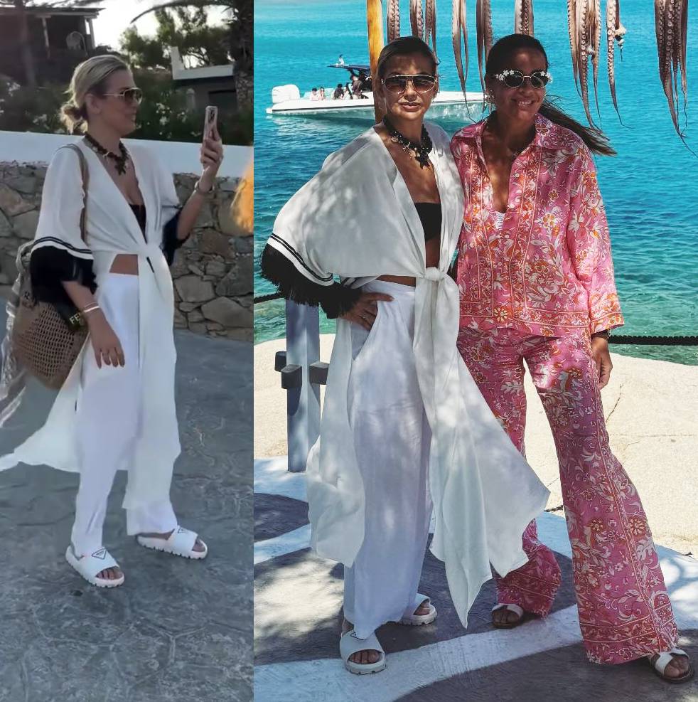 La conocedora de la moda conjugó su atuendo con la estética de la isla griega y eligió un diseño en algodón blanco, de grandes y acampanadas mangas que terminan en flecos negros. La parte delantera -que es totalmente abierta- la anudó al frente, dejando en completa caída la vista trasera.