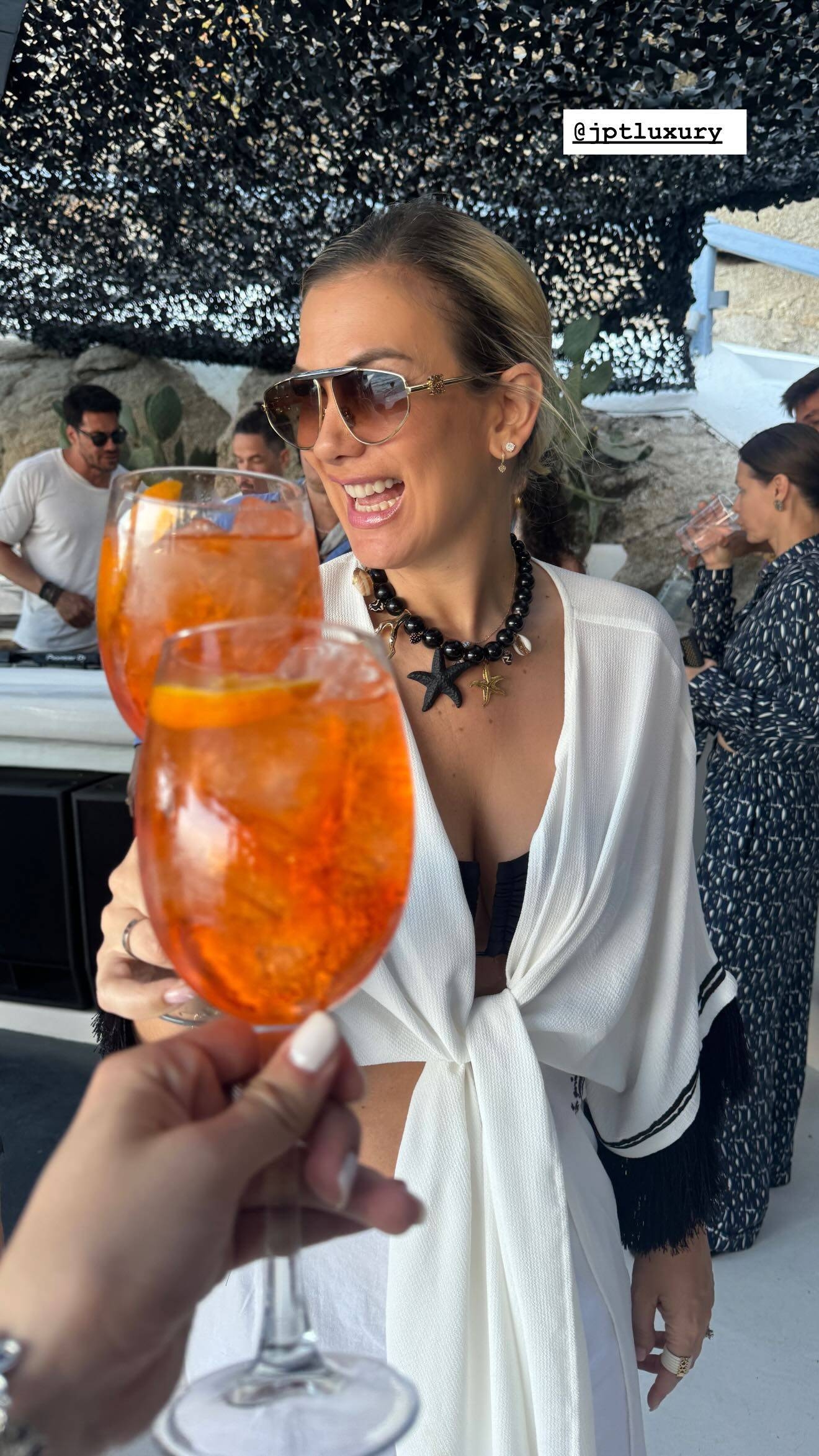 La exmodelo argentina lució feliz en un reconocido restaurante en la isla de Mykonos a la espera de una degustación de los platillos autóctonos, mientras el atardecer se ponía y regalaba una vista increíble.