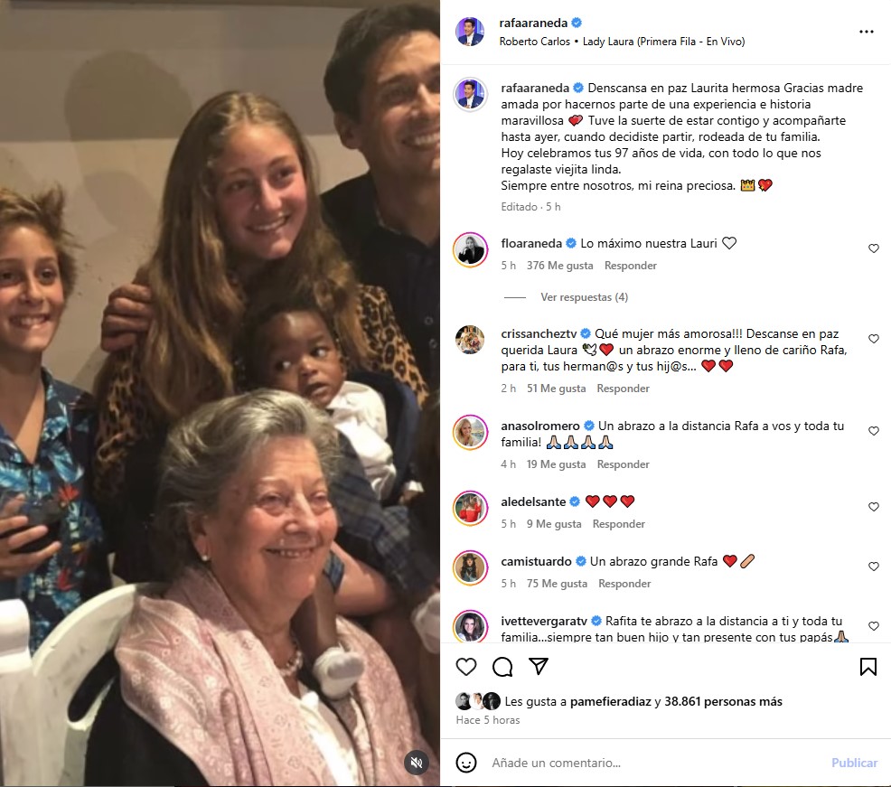 "Qué mujer más amorosa. Descanse en paz querida Laura, un abrazo enorme y lleno de cariño Rafa, para ti, tus hermanos y tus hijos", comentó Cristián Sánchez.