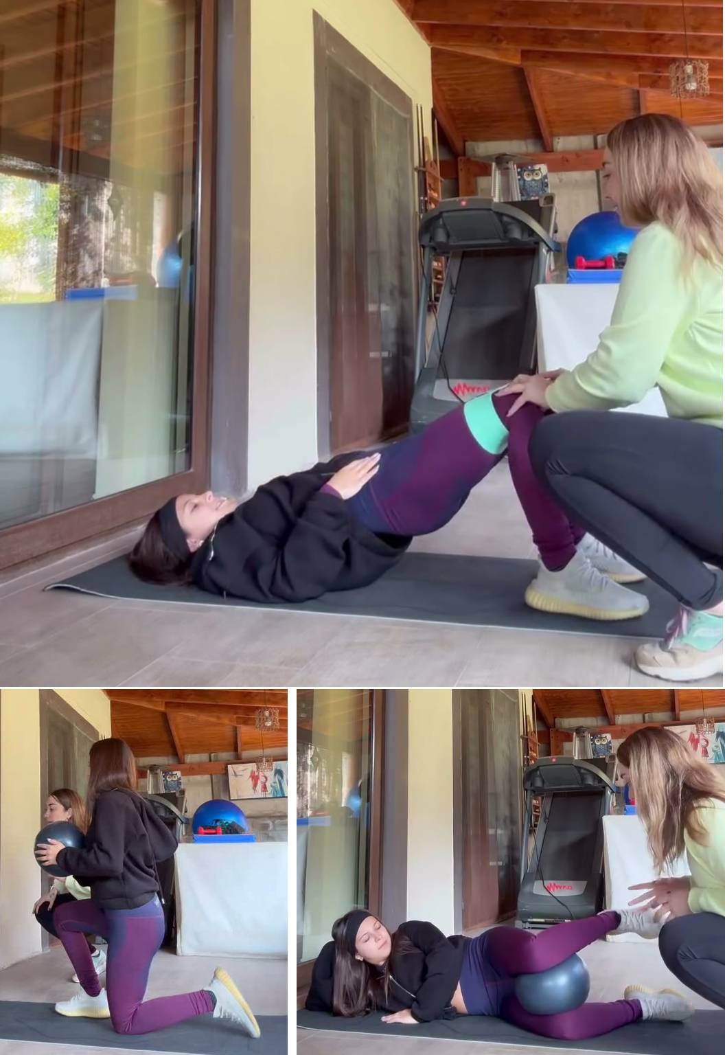 Desde el mat, ubicado en el piso de su patio, se le vio ejercitarse con una pelota, elemento que obliga a los músculos a trabajar más y a obtener mayor flexibilidad.