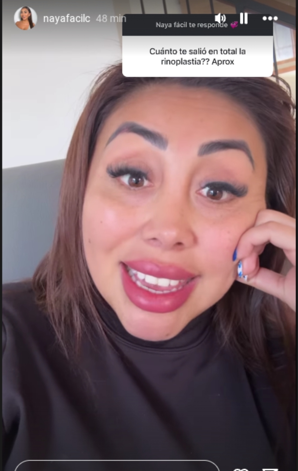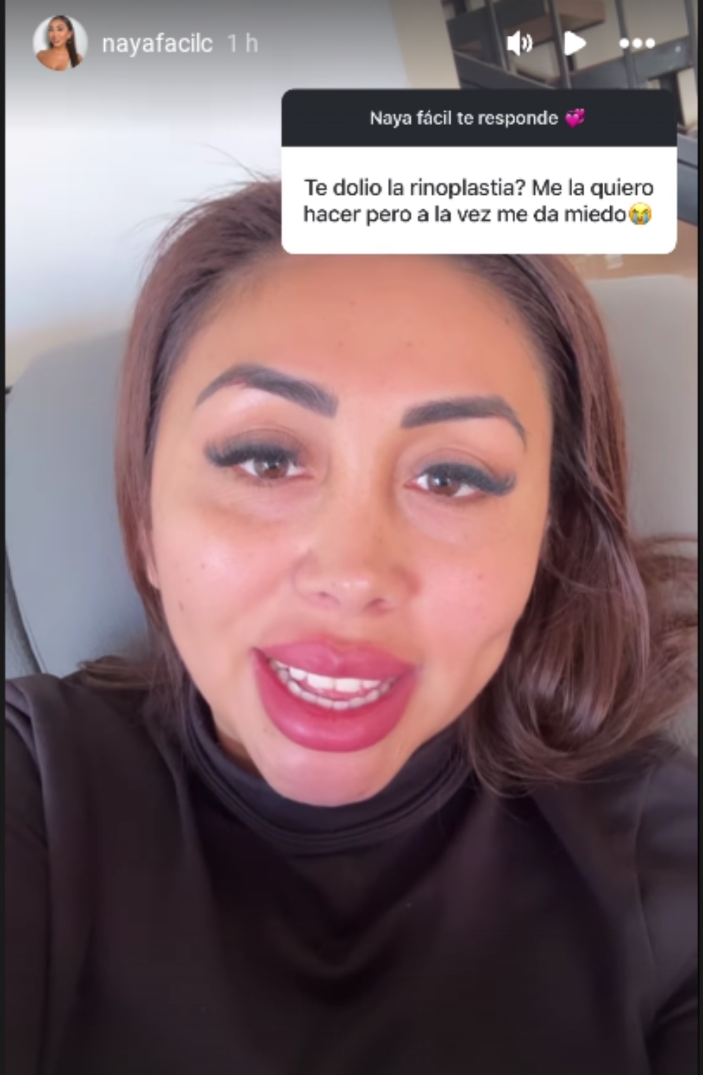 En ese contexto, recibió un mensaje de una seguidora que confesó su miedo a realizarse una cirugía plástica en la nariz por el dolor. “Créeme que la que menos duele es una rinoplastía. Duele menos que el ácido hialurónico”, contestó la influencer para calmar a su fan.